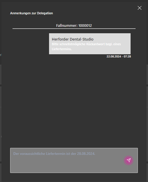 Angelegte Fälle können zur Weiterverarbeitung delegiert werden. Bei der Delegation können Kommentare für den Empfänger eingegeben werden. Dieser kann seinerseits mit einem Kommentar antworten. Hierbei handelt es sich um eine an einen Chat angelehnte Funktionalität.