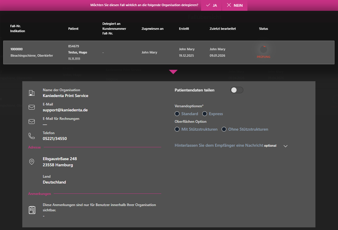 Unterhalb der Fallinformationen sehen Sie die Detialinformationen des Kaniedenta Print Service, an den Sie diesen Fall delegieren können.