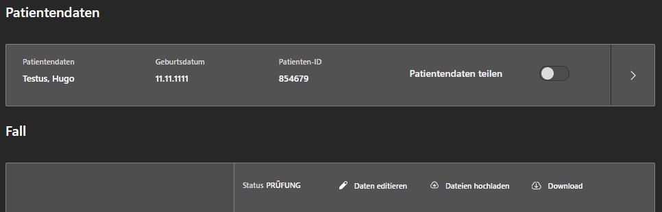 Wenn ein Fall delegiert wird, kann der Benutzer auswählen, ob die Patientendaten (Nachname, Vorname, Geburtsdatum) mit dem Delegationspartner geteilt werden sollen. Wird dieser Schalter aktiviert, muss der Benutzer zunächst einen Datenschutzhinweis bestätigen, bevor die Delegation abgeschlossen werden kann. Dies soll sicherstellen, dass das Labor oder die Praxis die Einverständnis des Patienten hierzu hat.