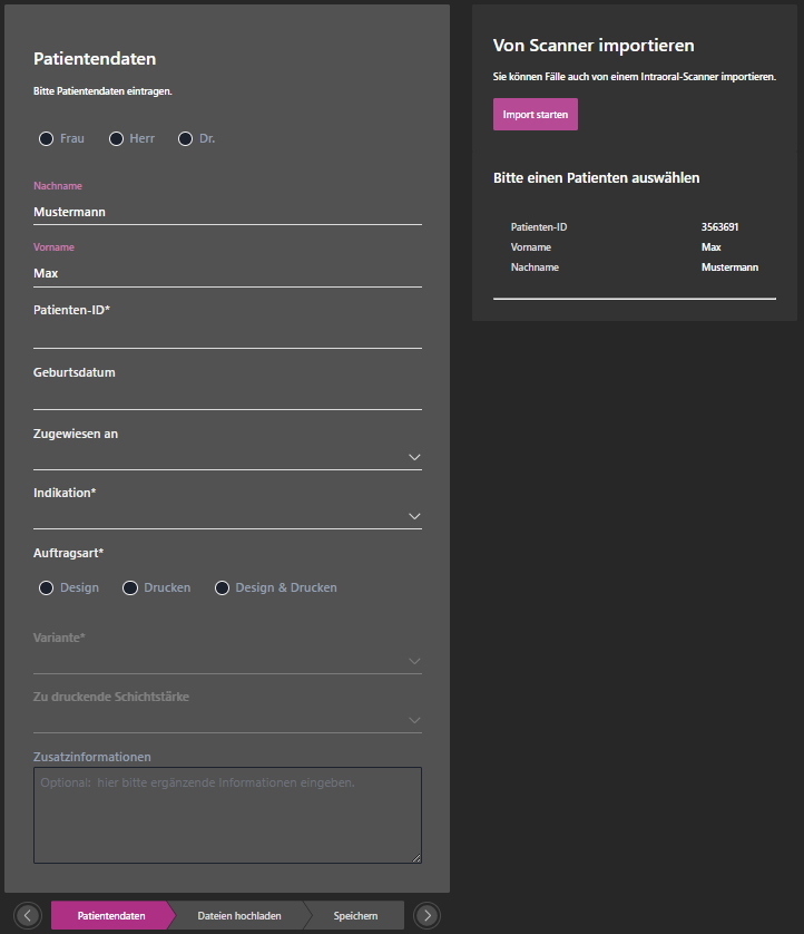 Im ersten Schritt gehen Sie genauso vor, als würden Sie einen neuen Fall, wie zuvor beschrieben, erstellen. Rechts neben dem Patientendaten-Dialog finden Sie eine Schaltfläche “Import starten”. Über diese Schaltfläche starten Sie den Prozess des Imports von Fällen von einem unterstützten Scanner.