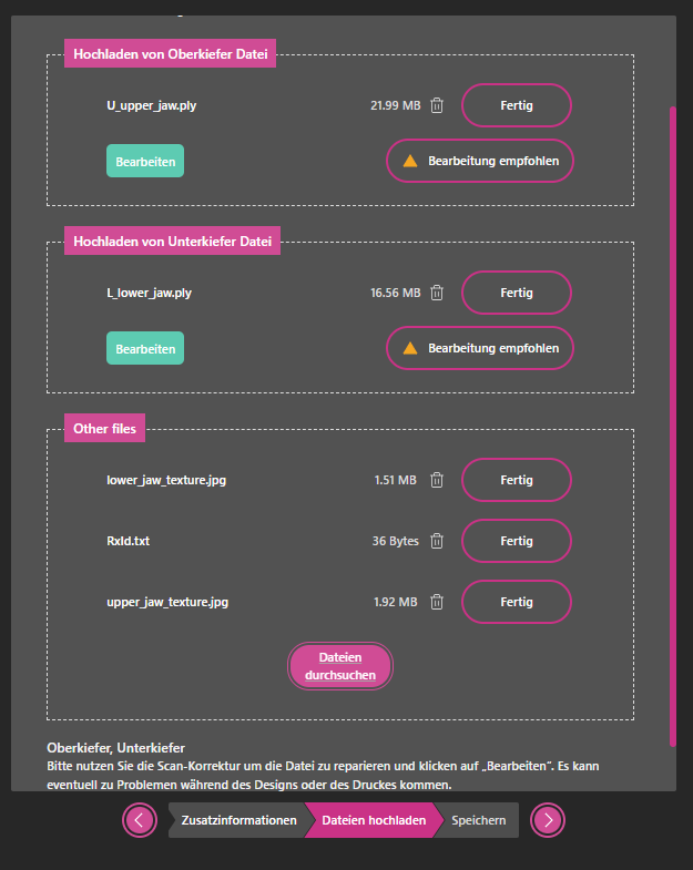 Sind Sie fertig mit der Bearbeitung, können Sie über den “weiter”- Button den bearbeiteten Scan abspeichern. Der vorher eingefügte Scan in der Dateiübertragung wird dann überschrieben mit dem neuen, bearbeiteten Scan.