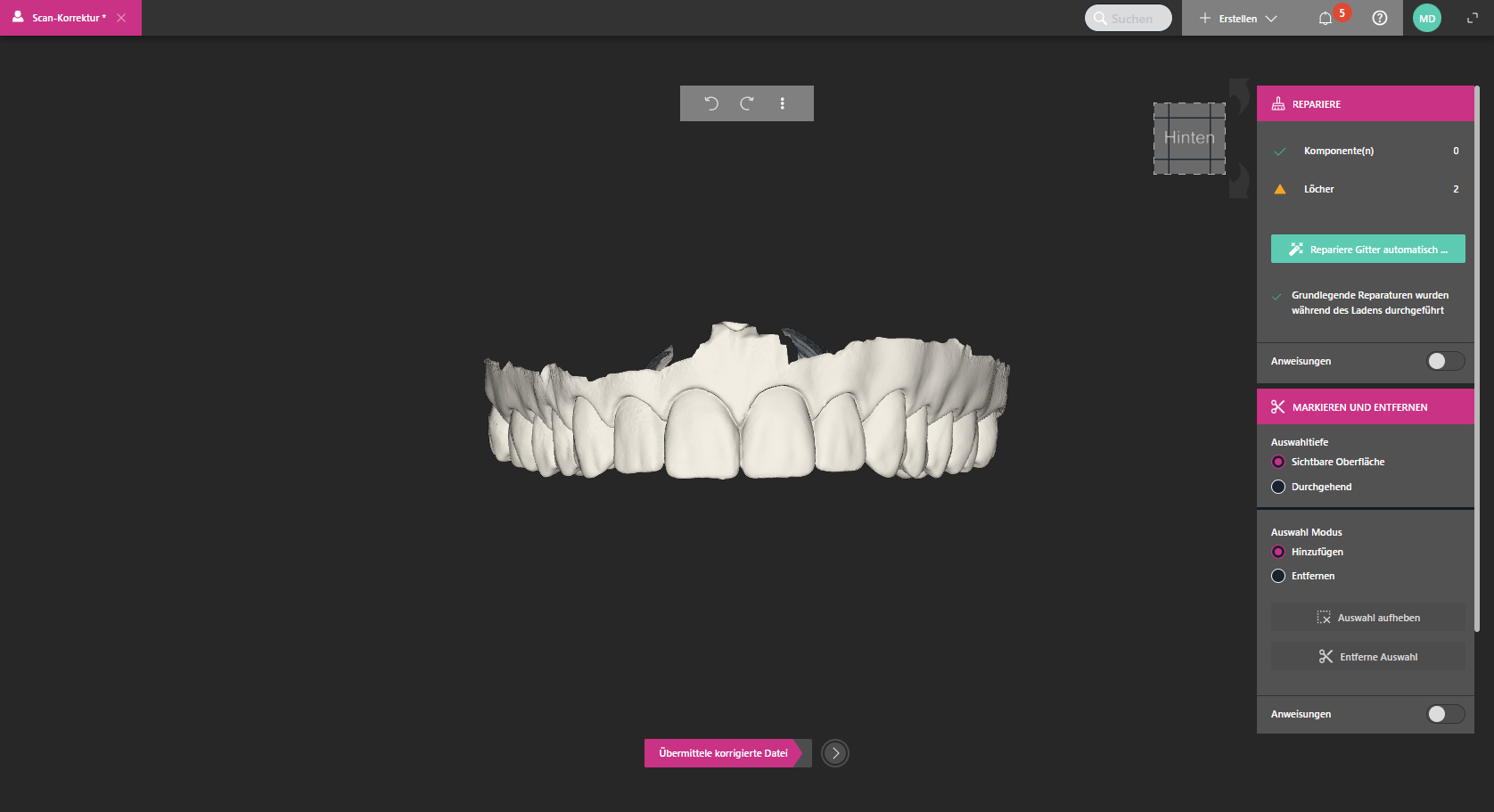 Wenn Sie die Scan-Korrektur geöffnet haben, haben Sie mehrere Optionen den Scan zu bearbeiten. Sie können den Scan beschneiden, sowie Löcher füllen. Die Software erkennt automatisch, ob Löcher oder freie Komponenten in diesem Scan vorhanden sind und gibt dies in dem rechten Menü aus. Beim öffnen der Scan-Korrektur werden bereits kleine Feinheiten bearbeitet um den Scan zu optimieren. Sie können entscheiden, ob Sie den Scan weiter optimieren möchten. Mit einem Klick auf den “repariere Gitter automatisch” Button, können Sie den Scan soweit optimieren, dass keine Löcher und keine freien Komponenten mehr vorhanden sind.