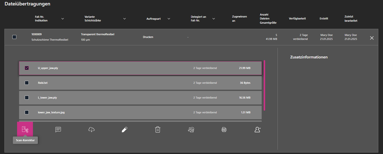 Zum Anderen können Sie die Scan-Korrektur über das Menü der Dateiübertragung aufrufen. Dafür müssen Sie den jeweiligen Scan auswählen und dann auf die Schere klicken.