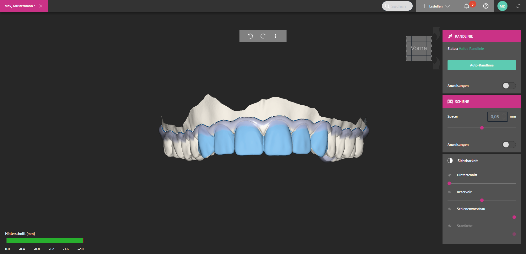 In diesem Schritt definieren Sie die Randlinie der Schiene durch Setzen einzelner Punkte oder mit nur einem Klick auf “Auto-Randlinie”. Der Erste Punkt wird immer grün angezeigt, während die Punkte, auf der die Maus zeigt, immer gelb markiert sind.